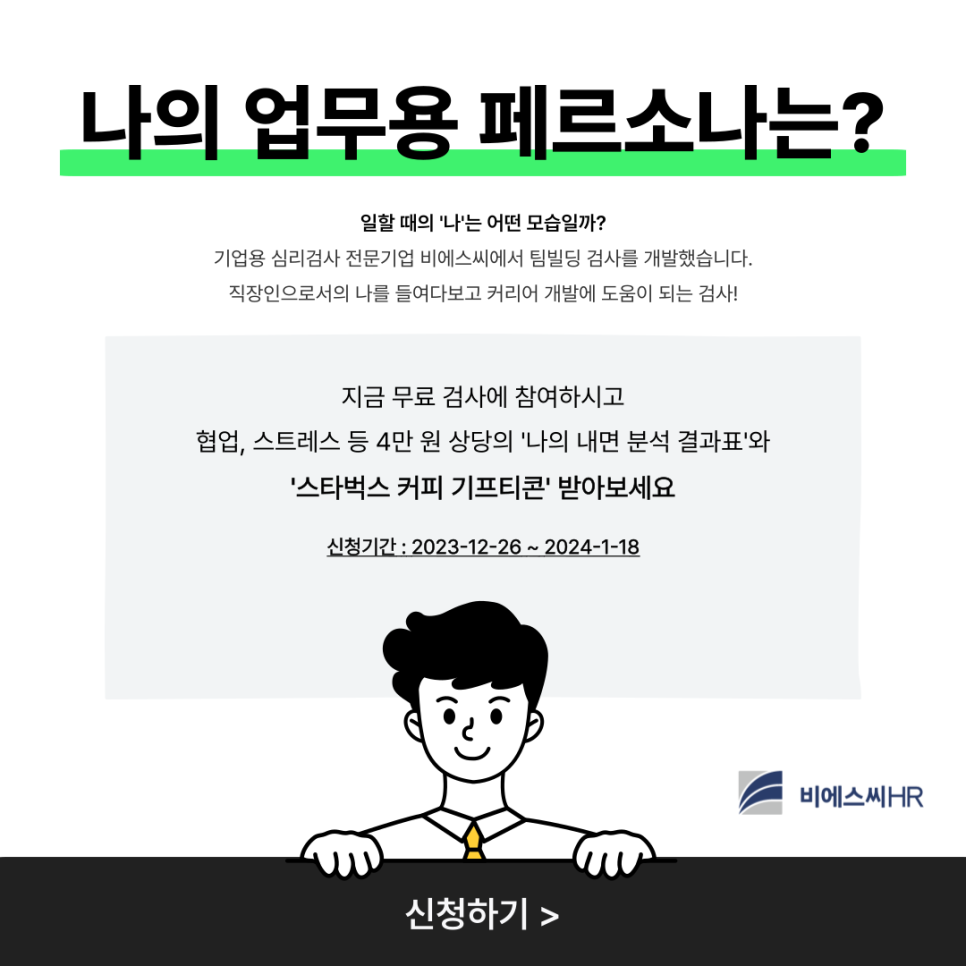 재직자 진단검사 전문기업 비에스씨에서 새로운 팀빌딩 검사를 런칭합니다.